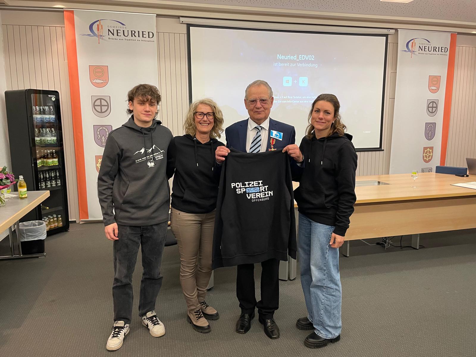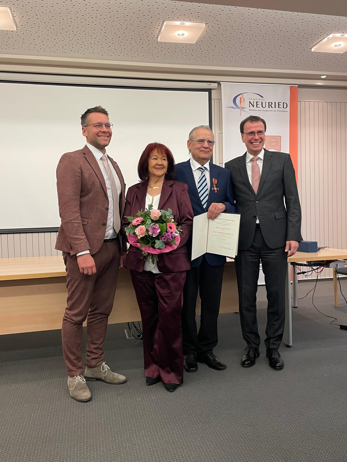 V.l.n.r.: Neurieds Bürgermeister Tobias Uhrich, Renate Schätzle, Gottfried Schätzle, Staatssekretär Volker Schebesta. -
