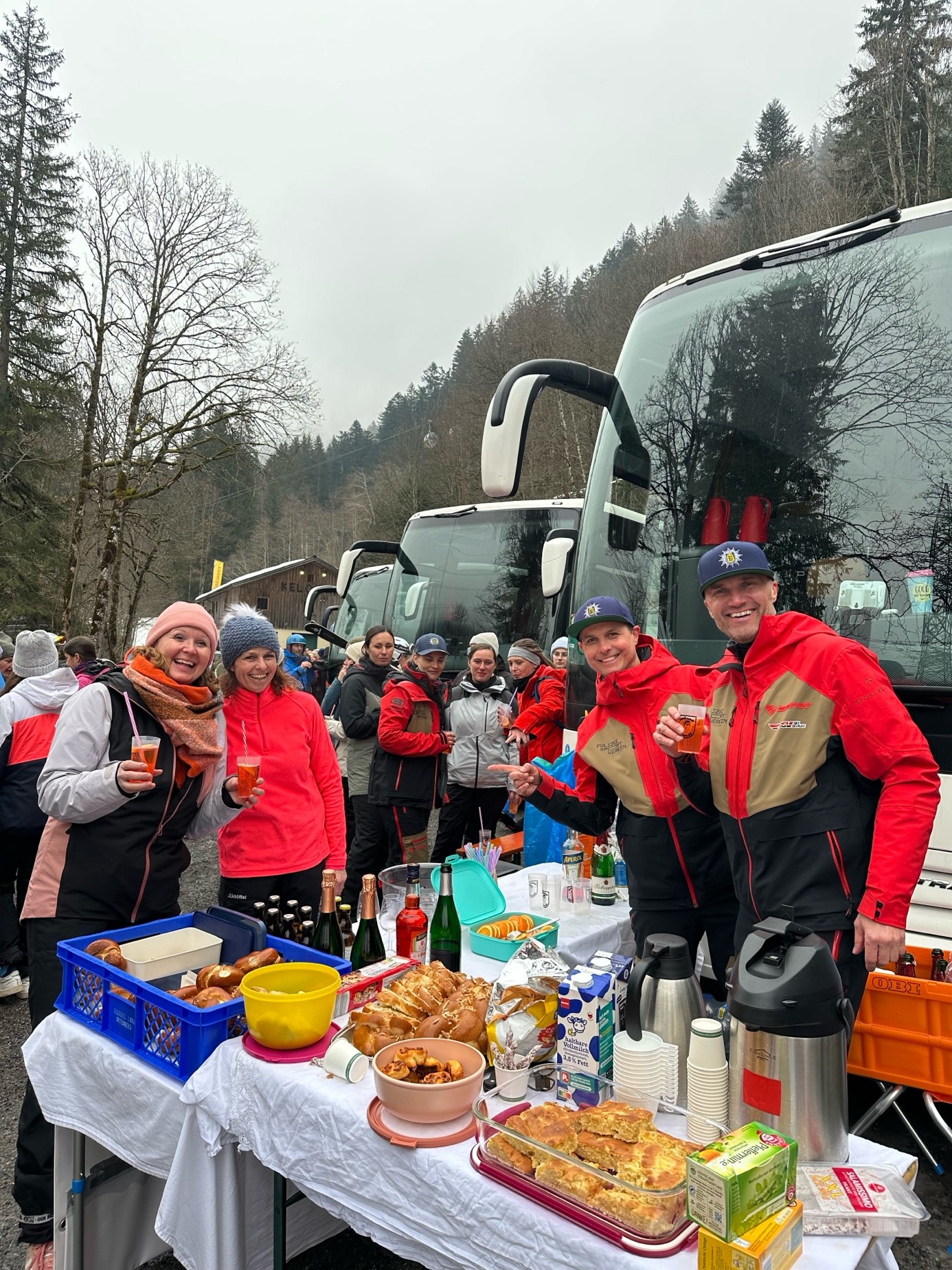 Um 4:00 Uhr ging es am 15.03. in Offenburg los. Motiviert wurden die Ski und Snowboards verstaut und auf der darauffolgenden Fahrt nochmal ordentlich Energie getankt. Denn uns war hier schon klar – in diesem Bus steckt Feierlaune! Schon beim Auffahren auf den Parkplatz am Sonnenkopf-Lift sah man in der Ferne das PSV-Banner strahlen. Endlich Sektfrühstück! Zwei auserwählte Skilehrer begrüßten den schon sehnsüchtig wartenden Bus voller Mädels mit Sekt vom Weingut Schloss Ortenberg sowie Laugengebäck und Hefezopf von der Bäckerei Lang aus Ortenberg. Wenn das nicht schon der perfekte Start für einen legendären Skitag war, dann aber die Sonne, die uns den gesamten Tag begleitete.
